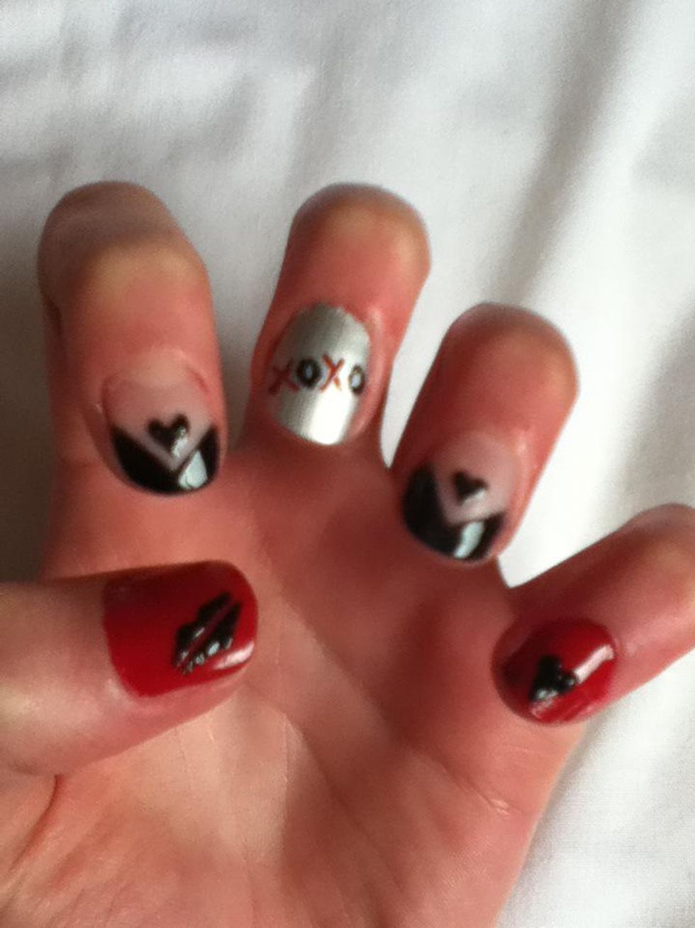 And on your middle finger, using nail art pens or just pencils and nail varnish, write XOXO in red and black (which means hugs and kisses).