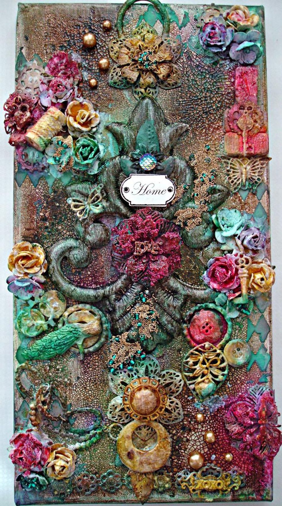 Once everything was dry, I started to place embellishments on the canvas. I used Gel Medium to glue the metal embellishments down and Fabri-tac to glue flowers down.