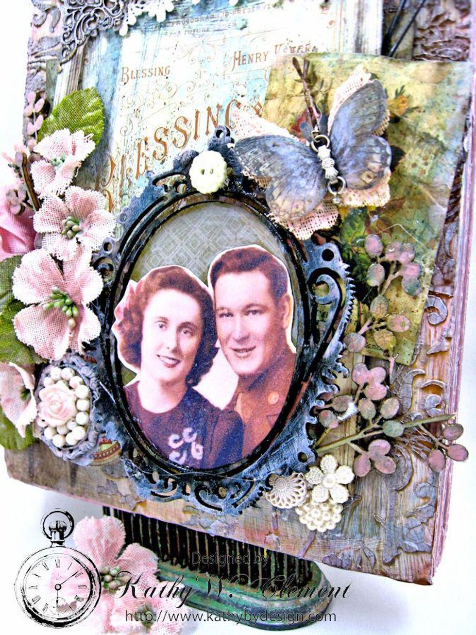 Layer ephemera beneath frame. Use Glossy Accents to secure cameo charm and metal corner.