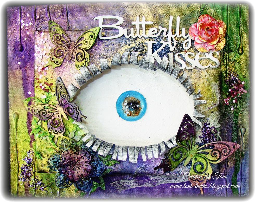 Using my sprays I then colored my butterflies and attached to the canvas.