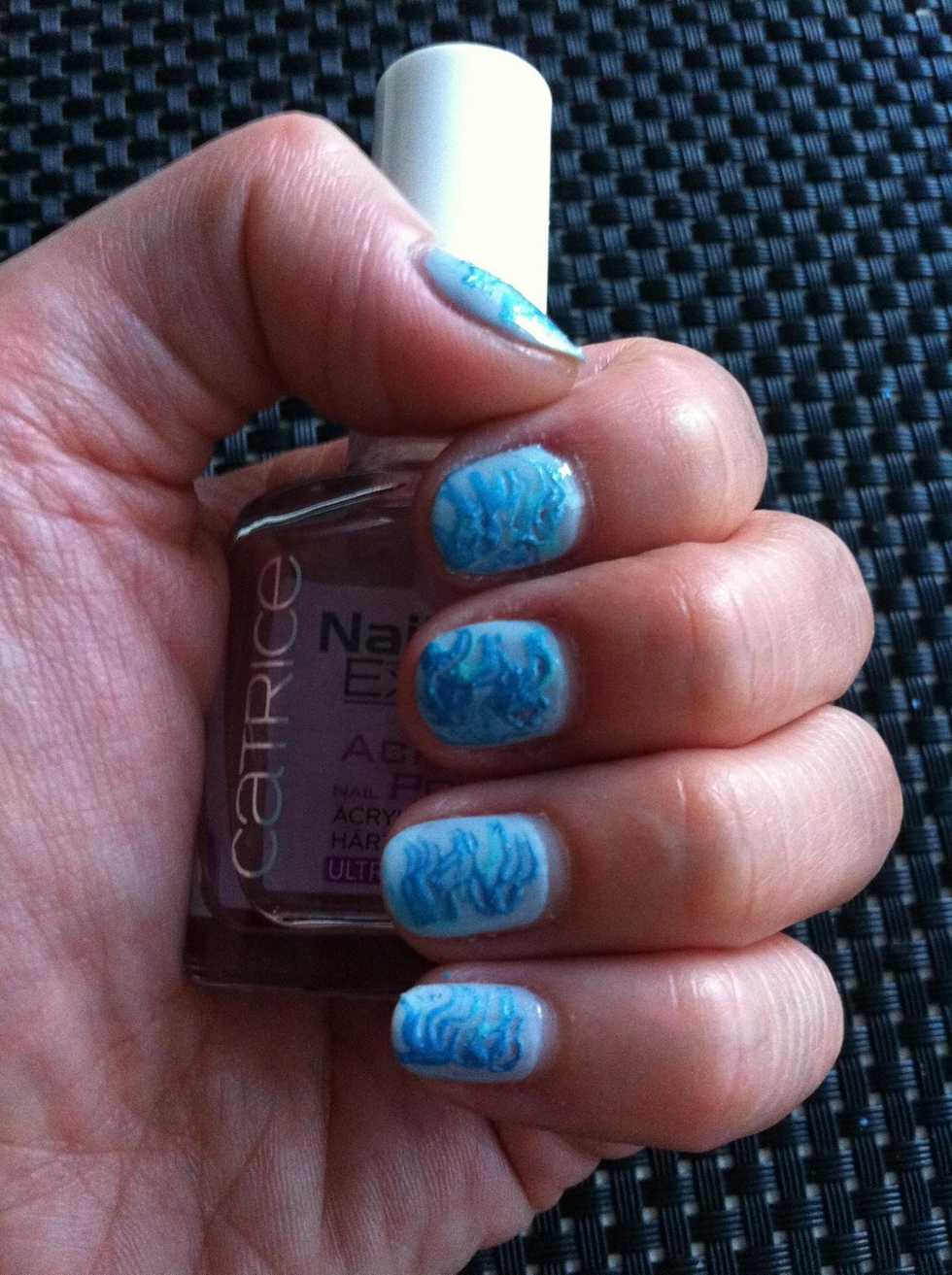 Gather your supplies. I used: P2 #542 'arctic', Essence #75 'gleam in blue', Essence #53 'you belong to me', Catrice top coat, Essence dotter and Essence nail polish corrector pencil.