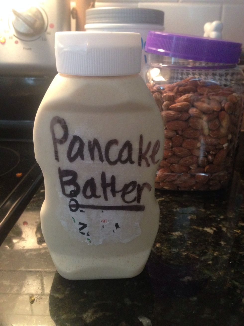 Combine batter into a cleaned out Ketchup bottle. Any batter will work, I just use Bisquik from the box.