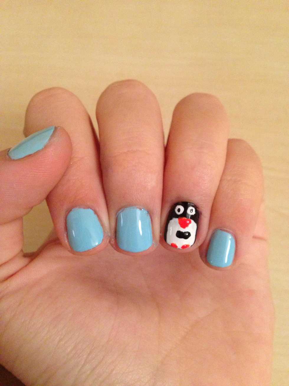 Make two dots with the orange nailpolish under the white part, these are gonna be your penguin's feet