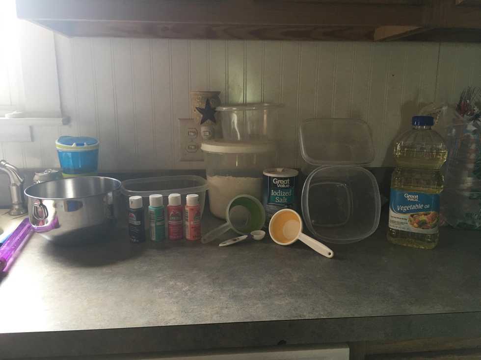 1 1/2 cup salt 4 cups flour 5 bowls 1/2 tablespoon of vetchtable oil Food coloring or paint 1 cup of warm water