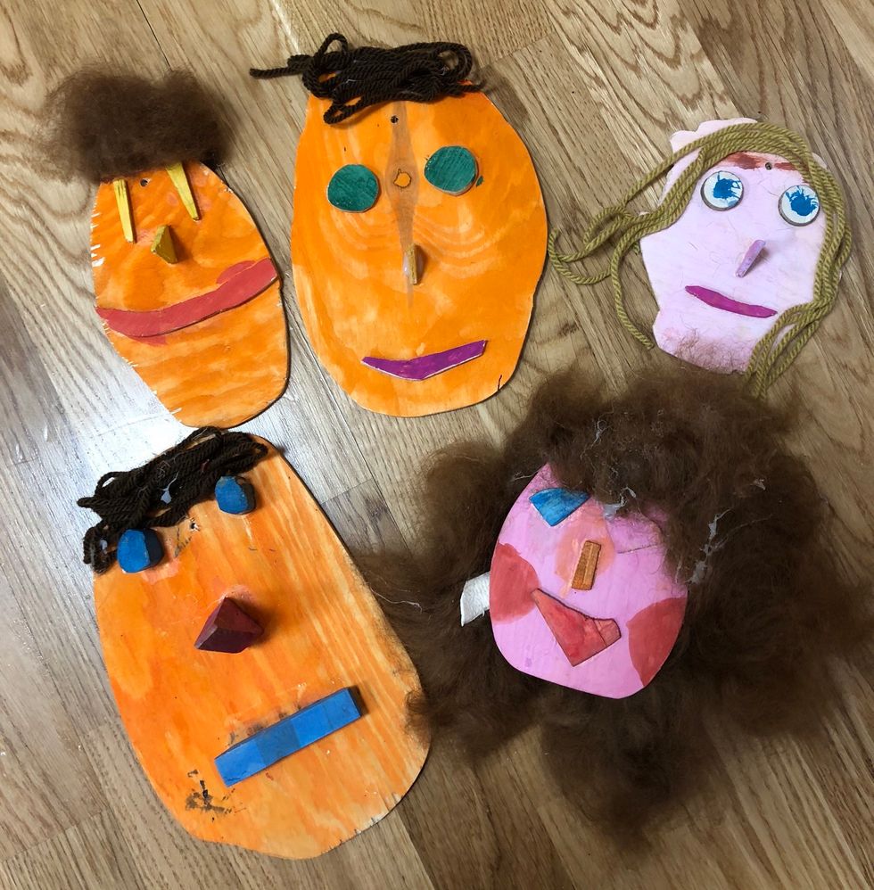 I de blå korgarna finns massa småbitar. Leta efter bitar som liknar dina bitar till ansiktet. Mun, ögon, näsa, ögonbryn med mera