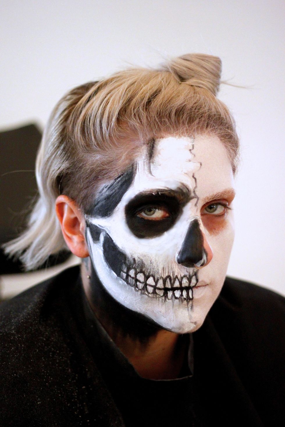 Using the pencil, draw the skull's negative spaces onto the face, like the eye sockets, temple recess, and contours of the cheek bone.