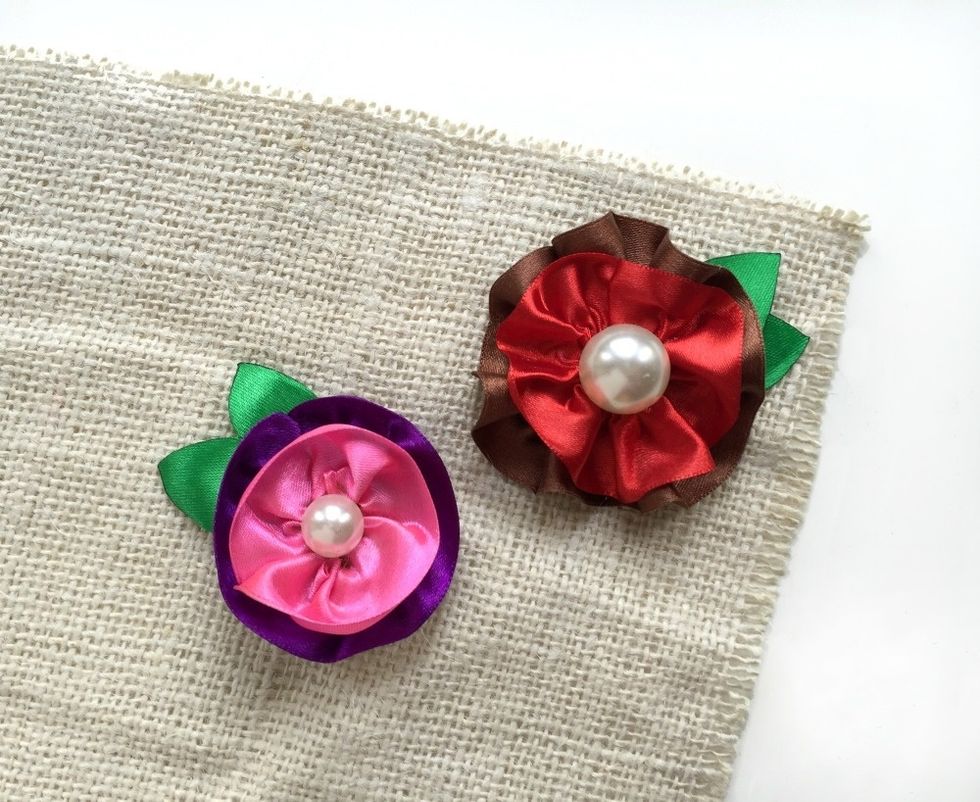 Cut a small piece of felt slightly bigger than the large ribbons center hole. Use green satin ribbons to make the leaves and also select a medium or large bead for the center for the flower.