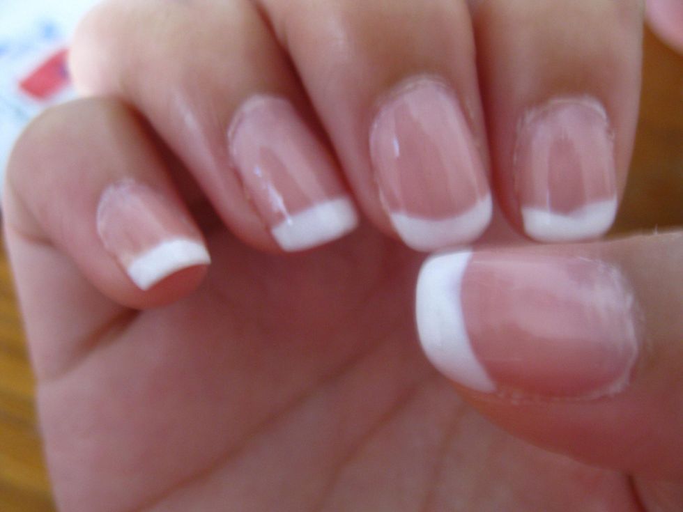 Clean nails, and apply a top coatOnce dried, apply your white polish on the tip of your nail however thick you want, you can do a straight line across, or curvedI did straight, and shade in!