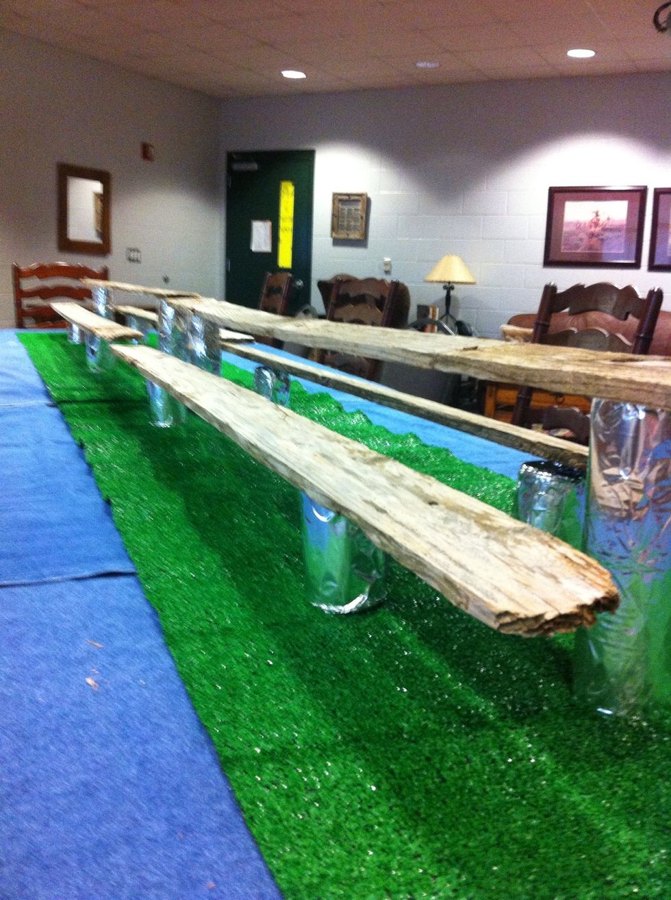 NOW. Place your double stacked cans down the middle of the table and lay one of the old fence boards on top.