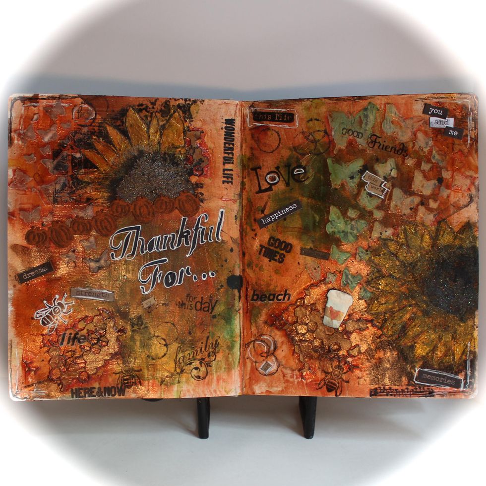 Then I added a tittle with Velvet in Tuxedo. I also added randomly, the words of what I am Thankful for. I used a variety of word materials from labels, rub-ons, my handwriting, and stickers.