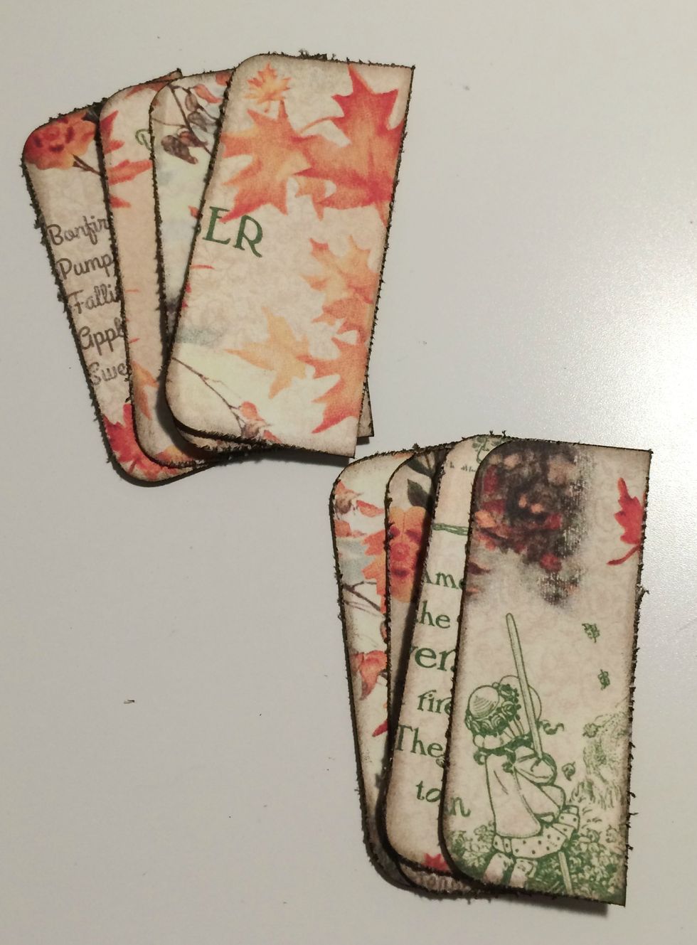 From the brown floral side of the November Montage paper, cut 4 pieces that measure 1 1/4" x 2 3/4", set aside. From the same side of paper, cut 4 pieces that measure 7/8" x 2 1/2", set aside.