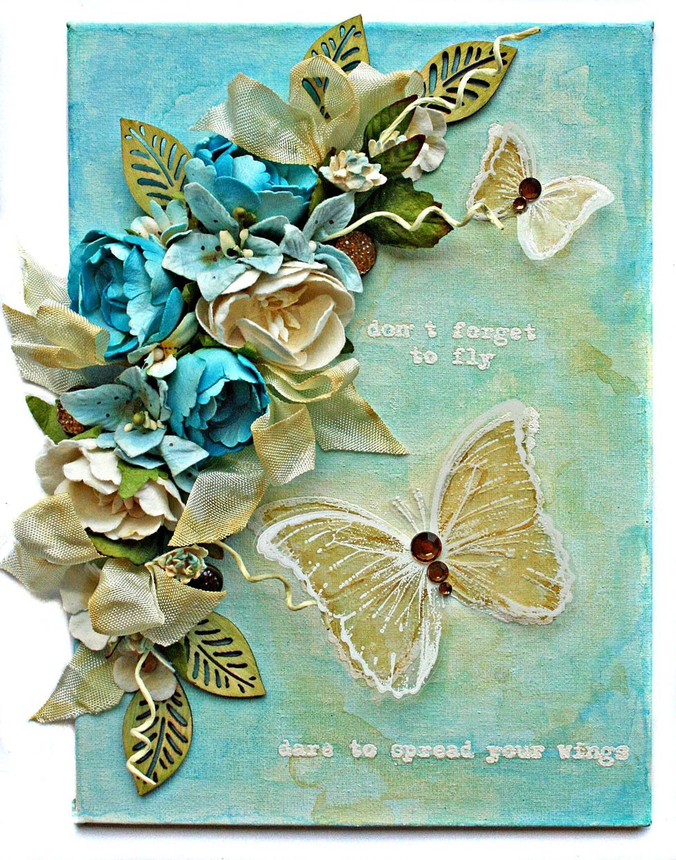 Stamp butterfly & words on watercolor canvas using embossing ink. Sprinkle with embossing powder. Tap off extra. Use heat gun to melt. Color in butterflies with watercolor pencils as desired.
