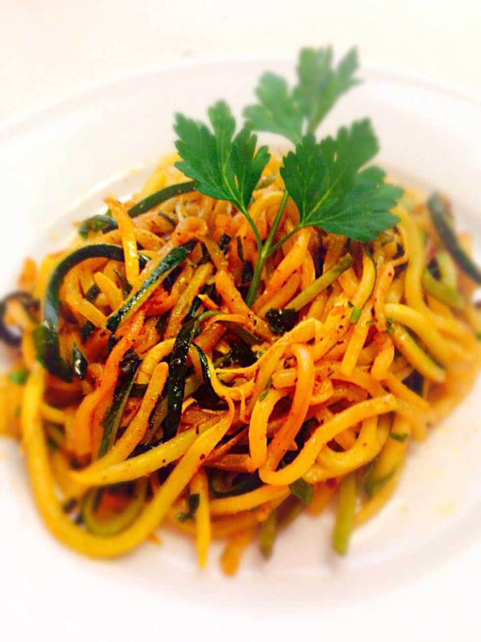 Cut the squash and zucchini into thin straws (preferably on mandolin slicer).