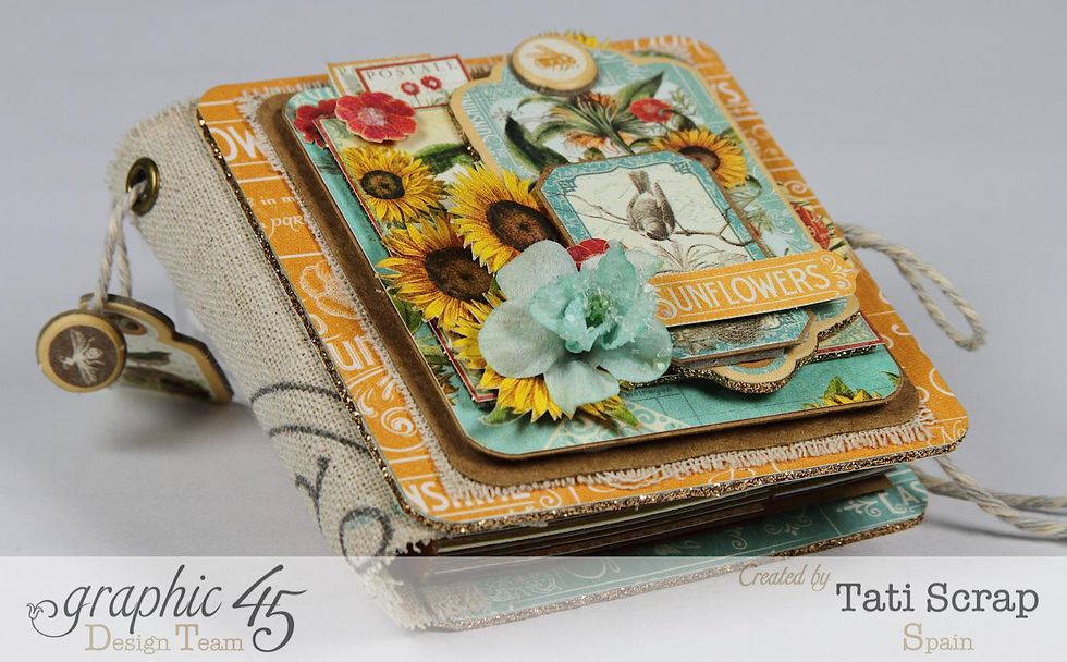 Cut a piece of burlap/ cotton fabric for to make the spine, and cut two pieces of Time to Flourish paper. You'll add to the back cover. And glue them to the piece of fabric.