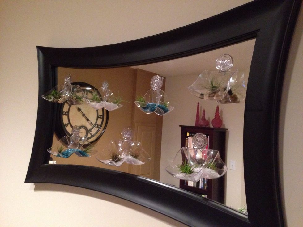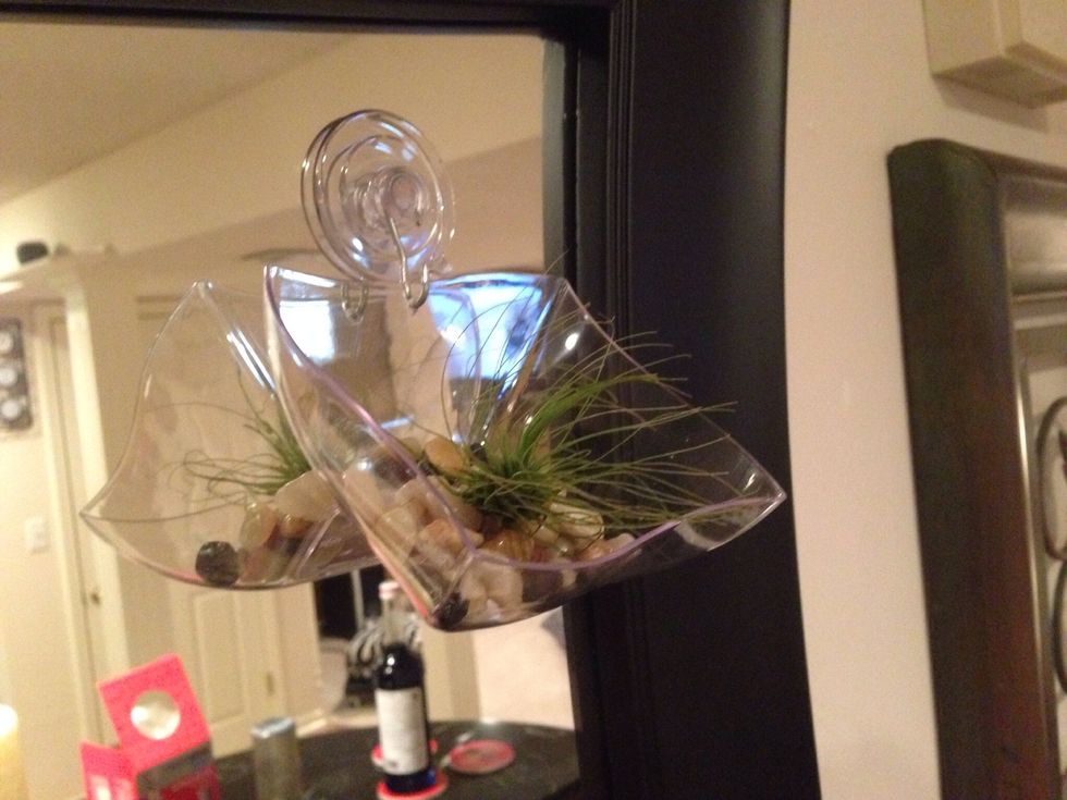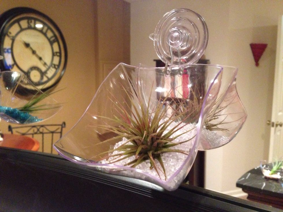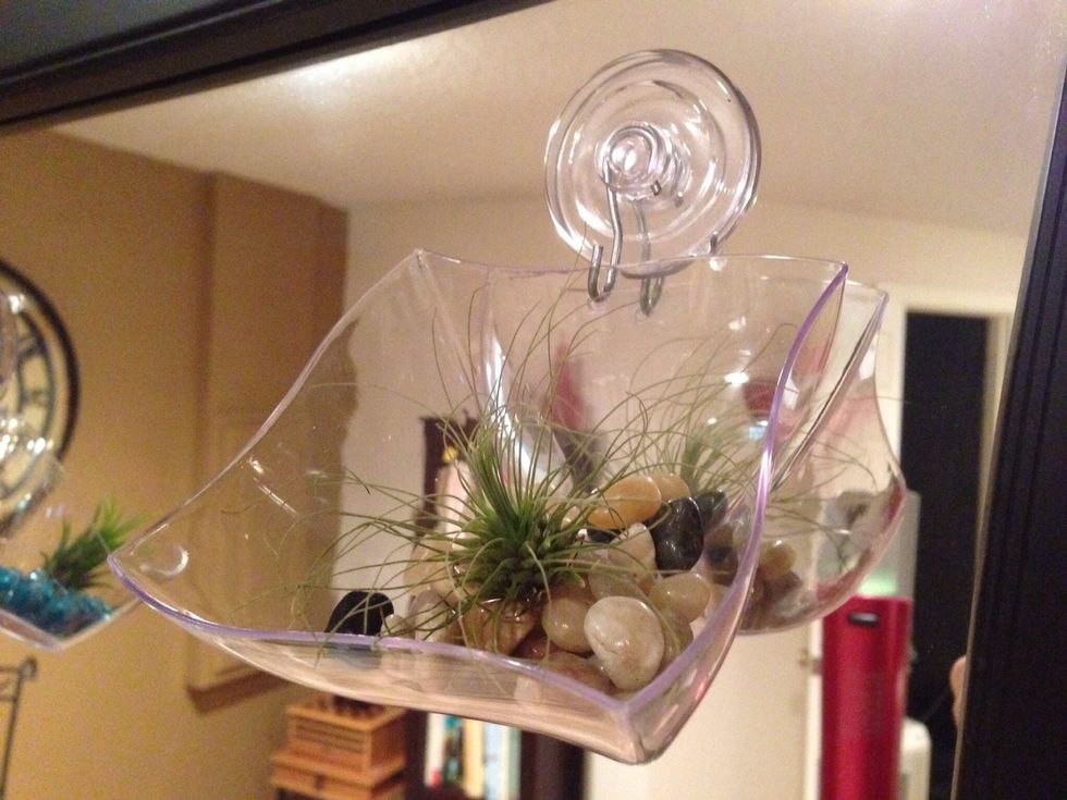 Here I used a mirror to hang to, and I filled the containers with blue glass, rocks, and white crystal pieces. The plant just sits loosely on top.