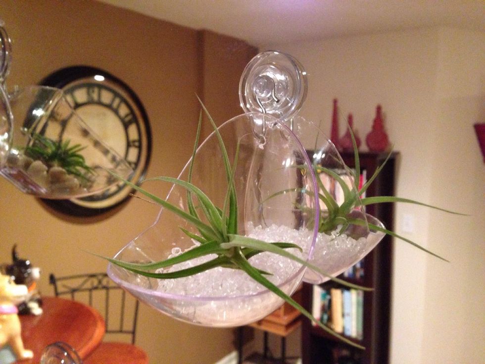 Here I used a mirror to hang to, and I filled the containers with blue glass, rocks, and white crystal pieces. The plant just sits loosely on top.
