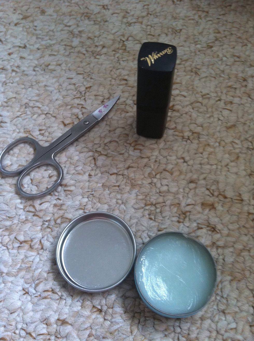 For my lip balm I will be using small scissors, Lipstick and a basic lip balm (mine is toffee scented&favoured to add to the delicious-ness)!
