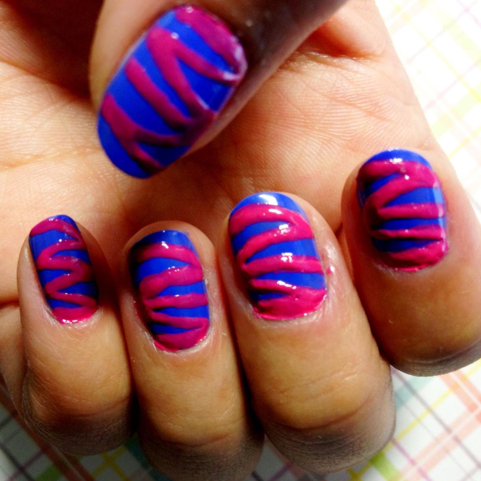 Paint base color.Using a nail brush, create zig zag lines in varying thickness.For more nail art, check out my blog: www.nailartcouture.blogspot.com
