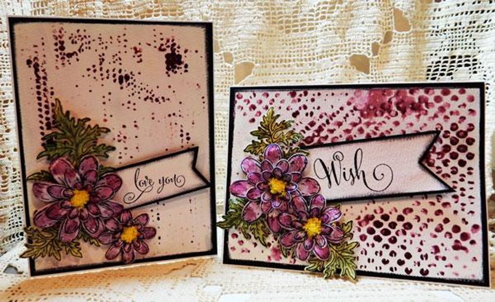 Ink the stenciled panel with black ink and mat with black cardstock. Assemble the daisies with brads. Add daisies and leaves to panel, adding foam adhesives where necessary. Add panel to card.