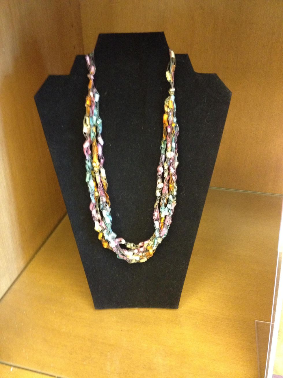 Supplies for crocheting a ribbon necklace. Examples of different colors of ribbon/trellis yarns.