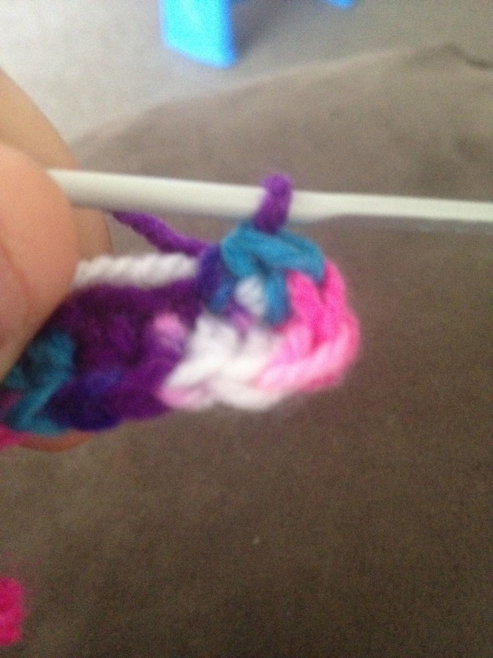 In remaining last chain make 3 half double crochet and hold in your short tail and arty it through stitches