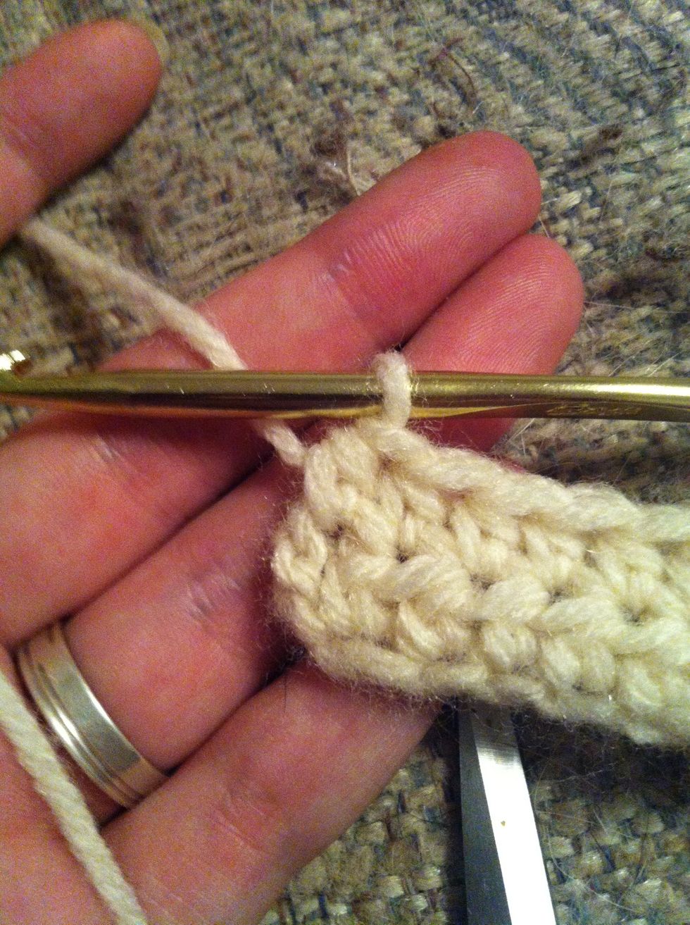 pull trough the 3 loops on your hook. that's the first half double crochet of your second row. keep going till you reach the end of your row.