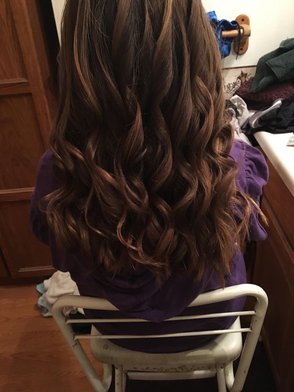 If you want a looser curl run hands through the curl. This is what is looks like when you do. If desired you can spray hair spray onto the entire head.