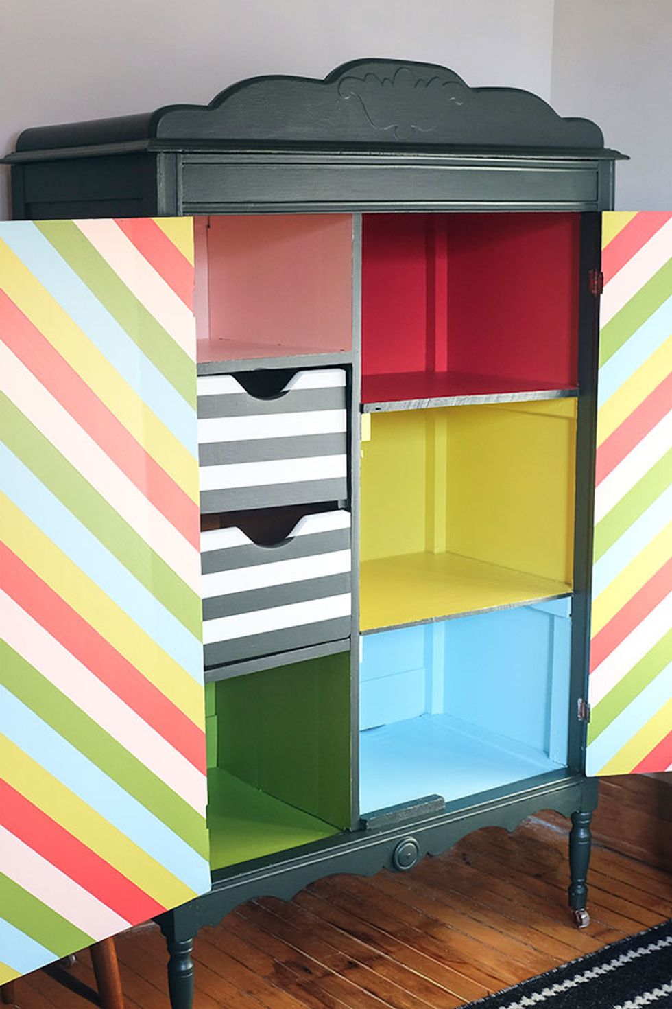 I went for a mix of horizontal and diagonal stripes, some colorful and some more restrained. I also painted each cubby a solid color, using the same mix of colors that were used for the stripes.