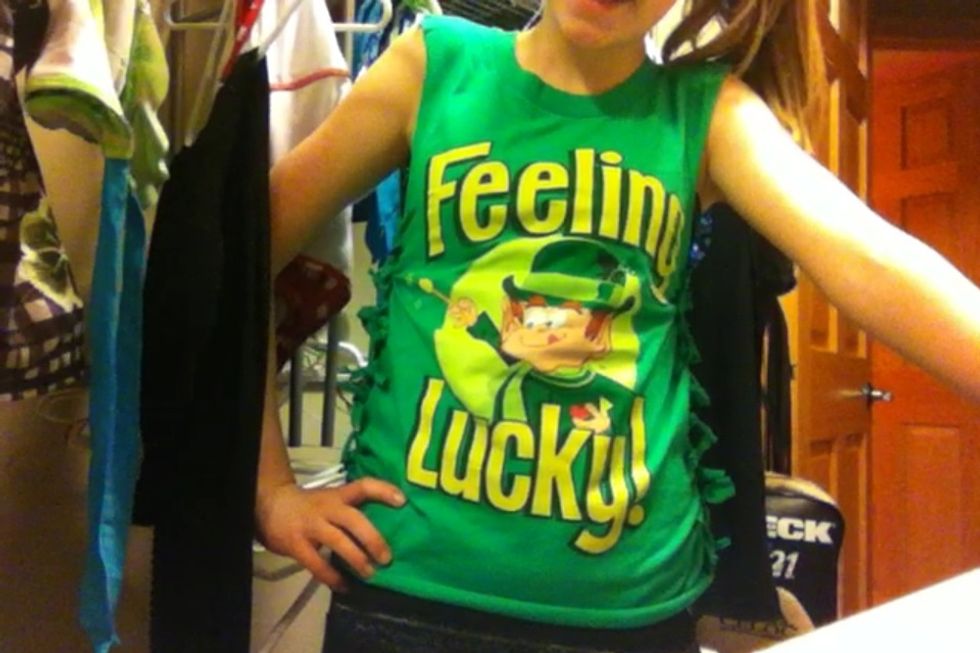 Fringe the sides by cutting them into about 1 inch strips, also cut off some of the bottom if it is long for you.