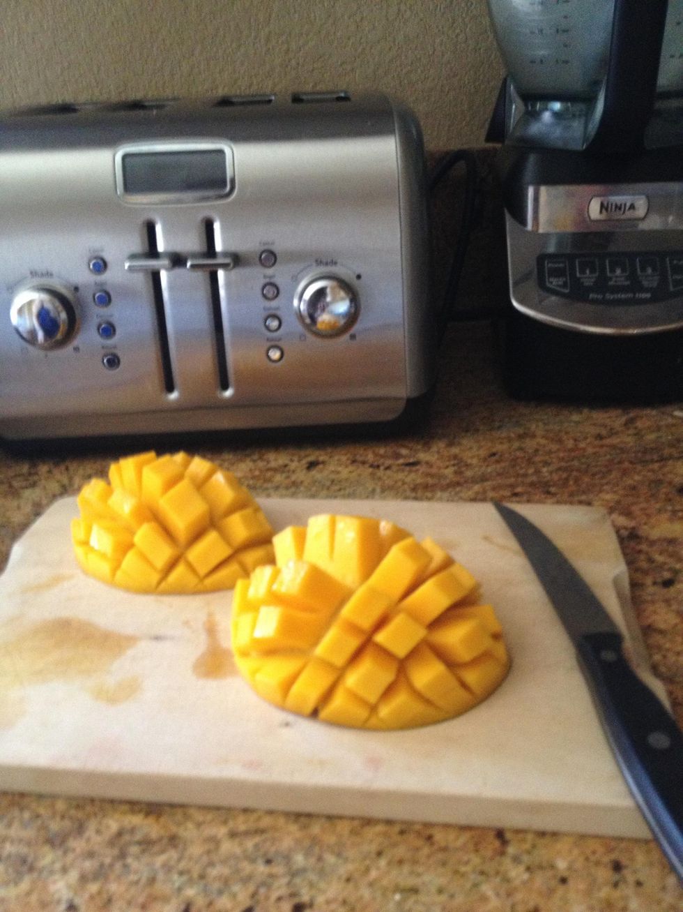 first start with a clean ripe mangocut the mango into 3 portionscut horizontal lines on the insidethen cut vertical linesnow flip it inside out and voila!