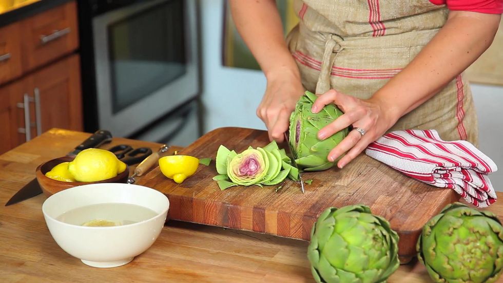Place the artichoke on your cutting board. Use a chef’s knife to slice vertically through the middle of the stem and the rest of the artichoke.