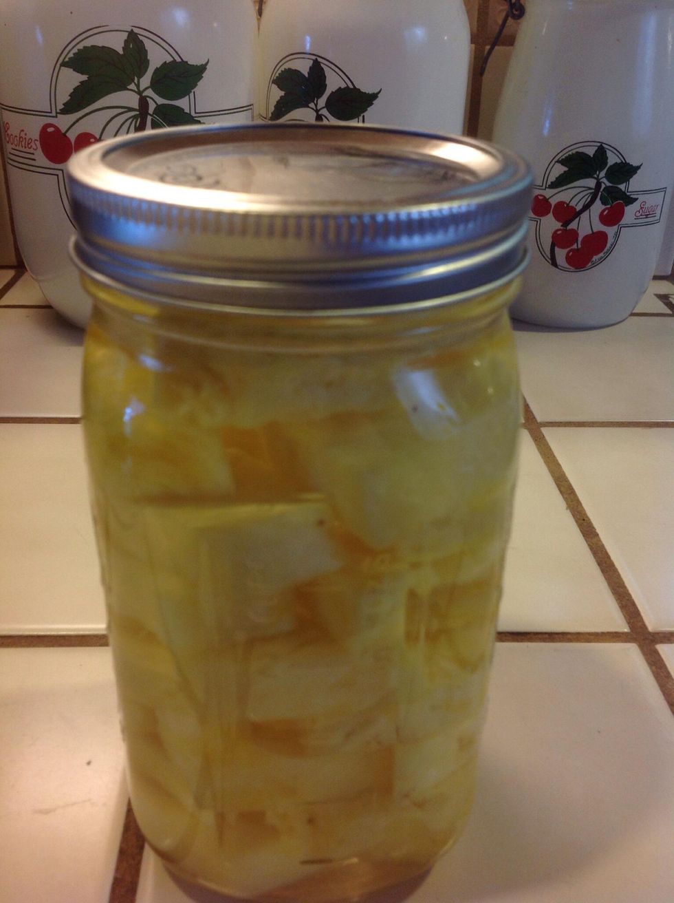 Stack pineapple chunks around the edge of a wide mouth jar...