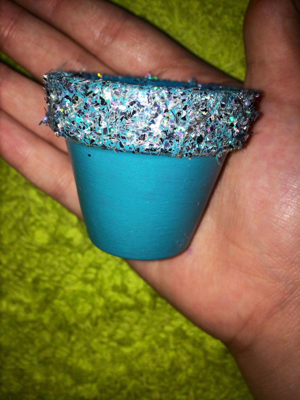Carefully add the glitter to the wet paint. If you get some glitter on the other part of the pot like I did, don't worry . It wipes off with ease.