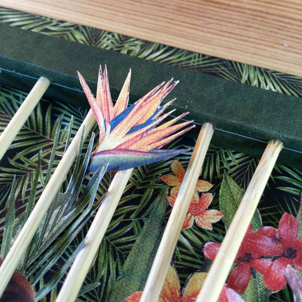 Select a paper for the back of the cage. Glue the paper on a cardboard. Use glue and foam squares to give dimension to the flowers.