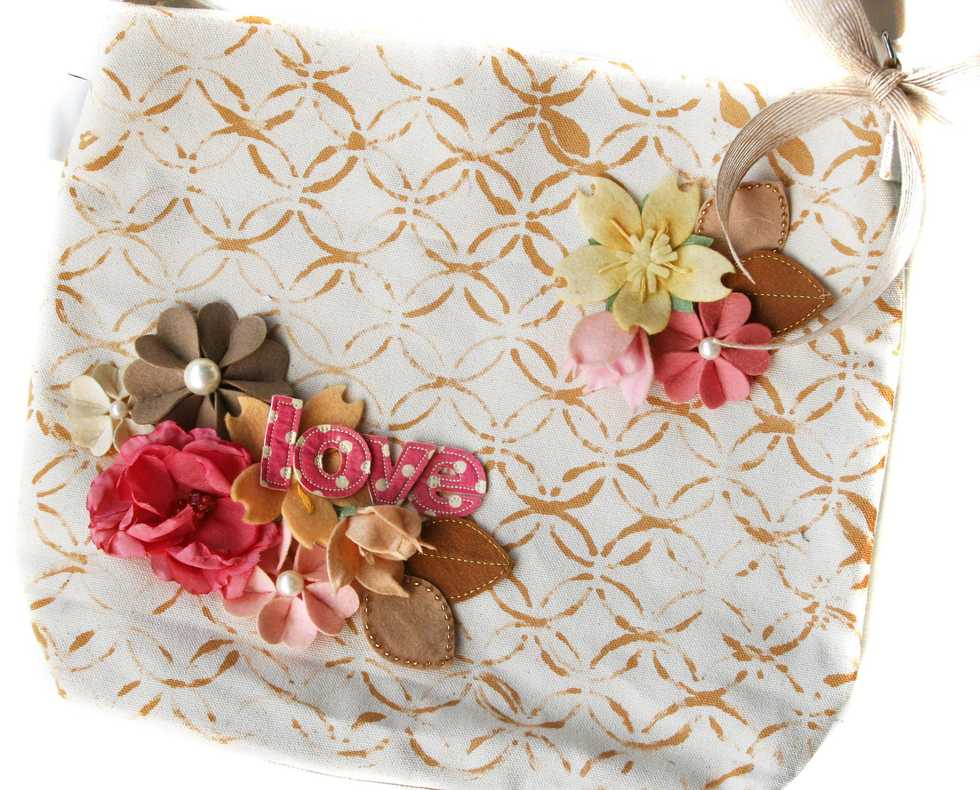 Group flowers and leaves as shown to upper right side of bag front. Once you like the results glue into place with Fabri-Tac.