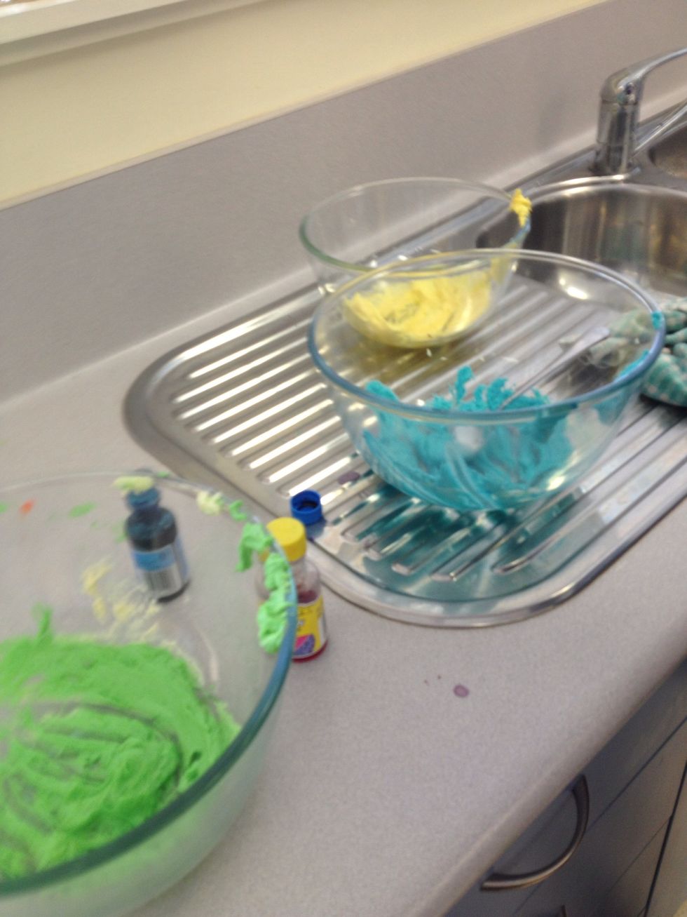 First split your buttercream icing into separate bowls (6 Bowls) then mix your food colouring into the bowls. Red, Orange, Yellow, green, blue and purple icing. (Each bowl has different icing)