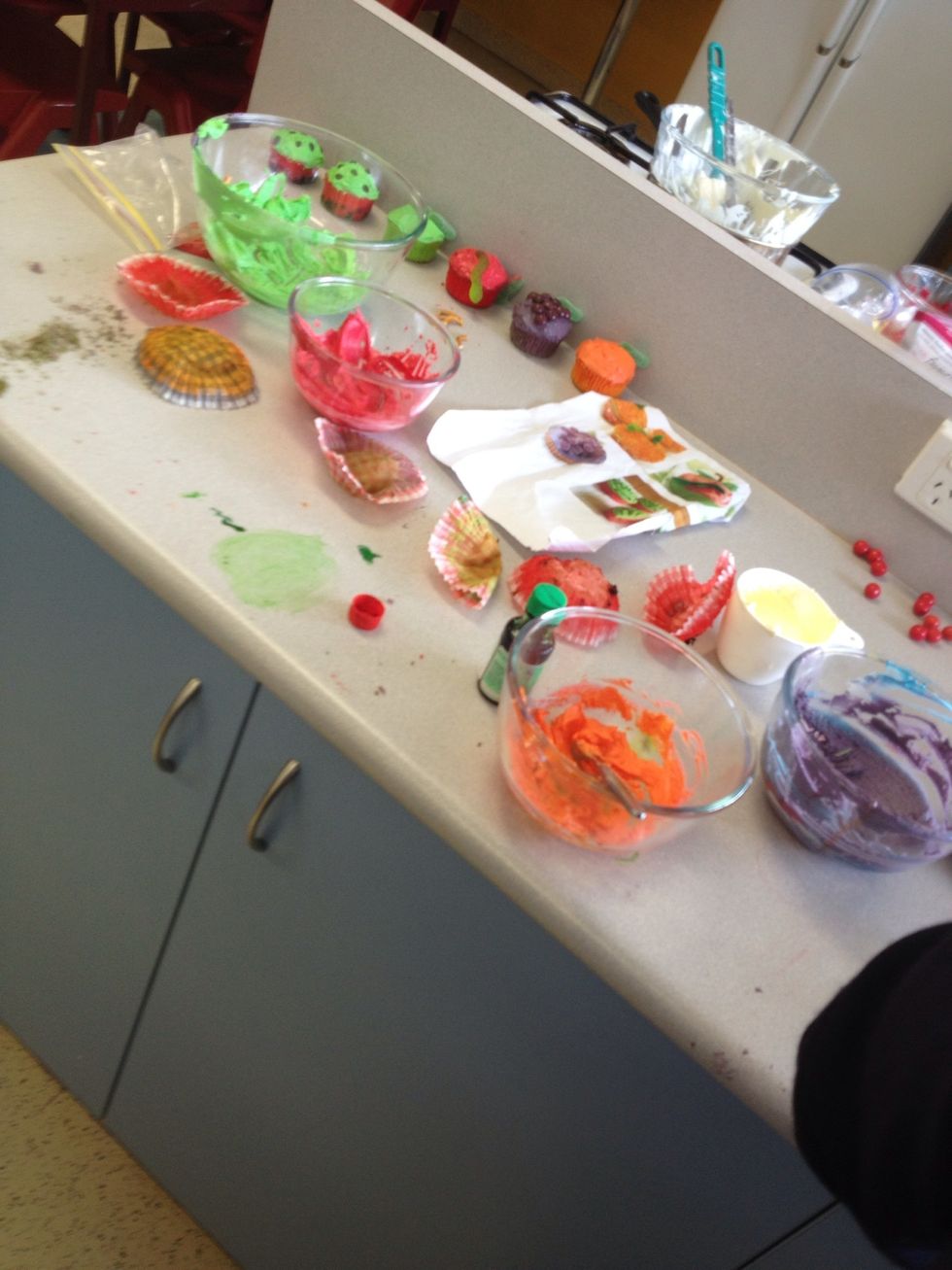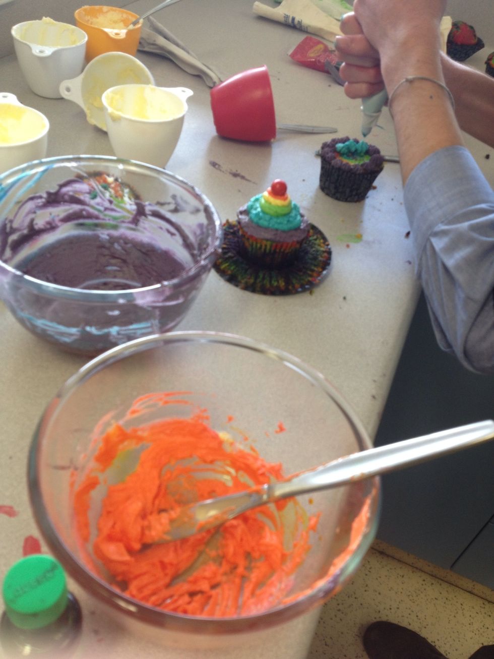 Now ice the bottom layer of the cupcake in a purple icing you have prepared before, continue to layer the cupcake going from the bottom (purple, blue, green, yellow, orange)