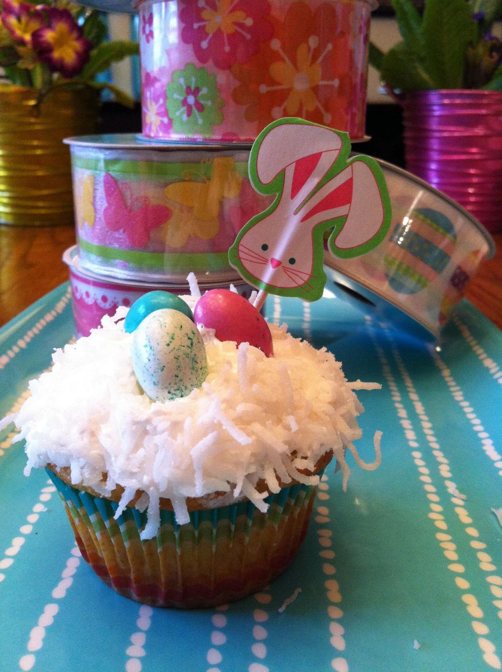 •Add icing to the tops of cupcakes •Then hold them upside down •Gently coat them into the shredded coconut •Place three eggs into the center •Add toothpick character