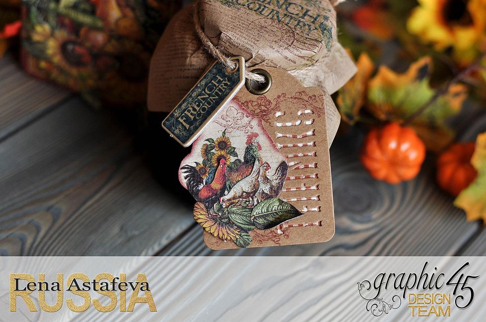 Cut out the square sized 15x15cmMake drawing the stampsdecorate the jarThen make a tag for this jar,using the Kraft ATC tags Graphic 45Cut out pictures from the collection "French Country"
