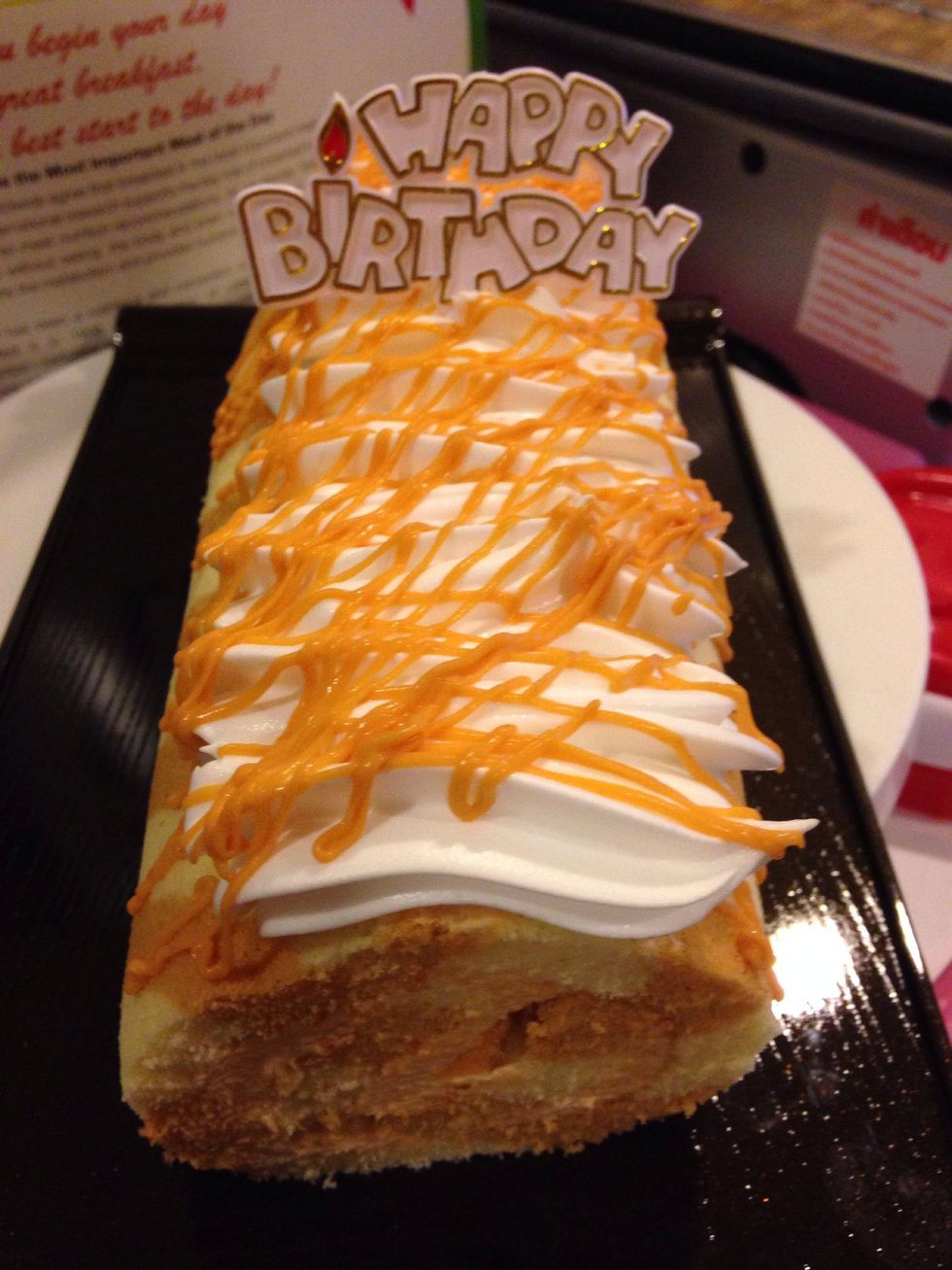 Roll cake and then decorate with whiping cream and thai tea sauce