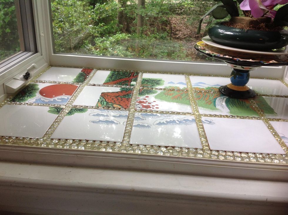I bought the tiles at a thrift store for 28 cents each. I decided on the marbles for two reasons. One I did not want to start cutting tile, and two I needed to fill in extra space.