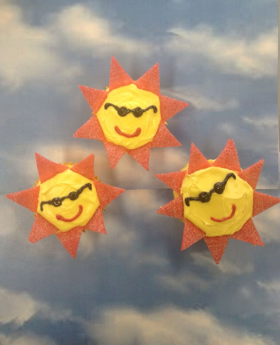 Squeeze the black gel writing icing to make sunglasses for Mr. Sun and also the same with the red gel writing icing to create his smile