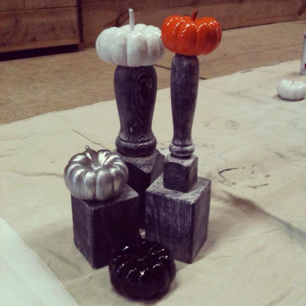 Place painted pumpkins on the flat tops of your pillars and group them as you please. That's it! Easy as (pumpkin) pie. :)