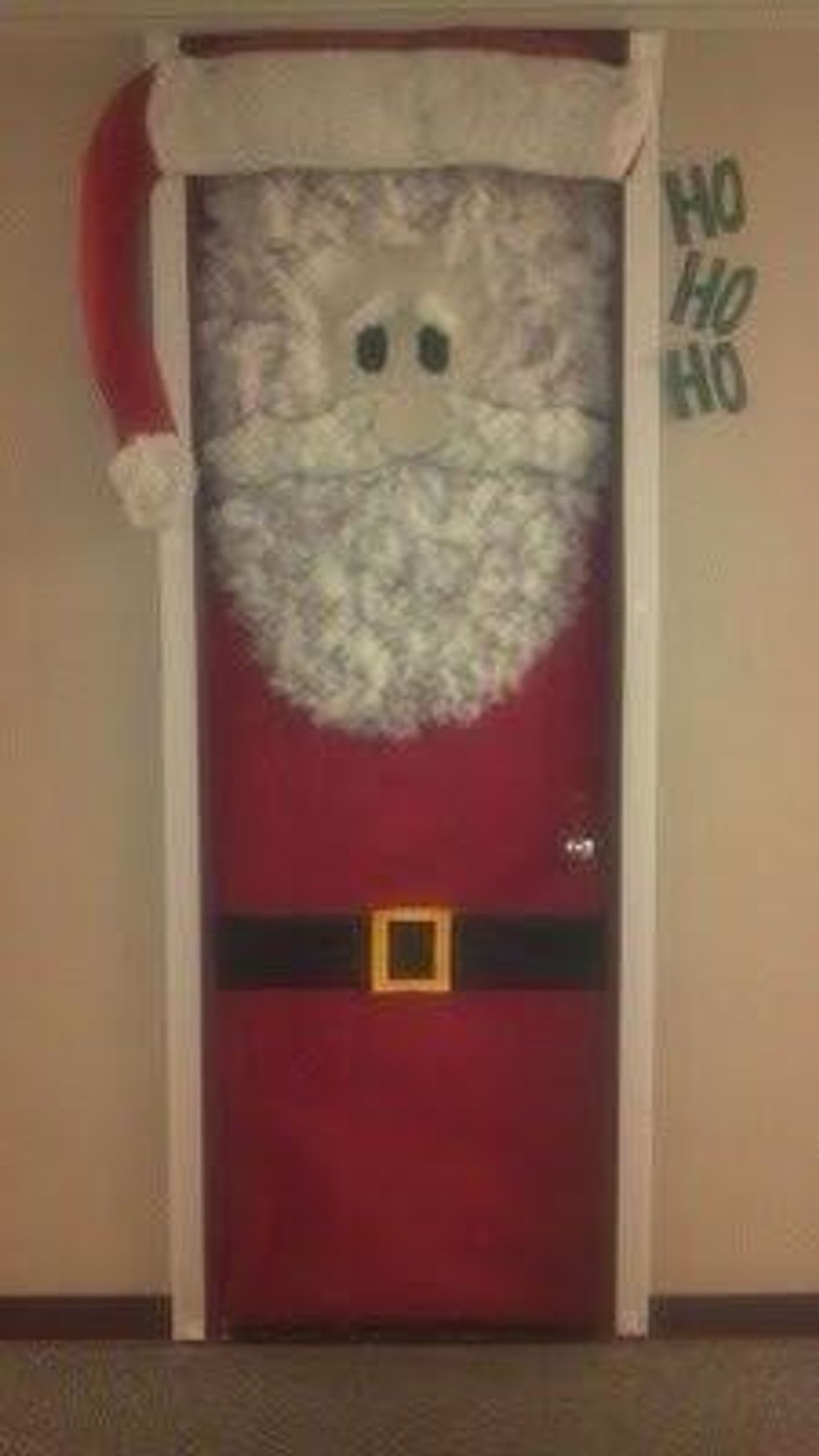 Tape the red hat to the top part of the door frame and use the cotton balls for the ball at the end and the bottom.
