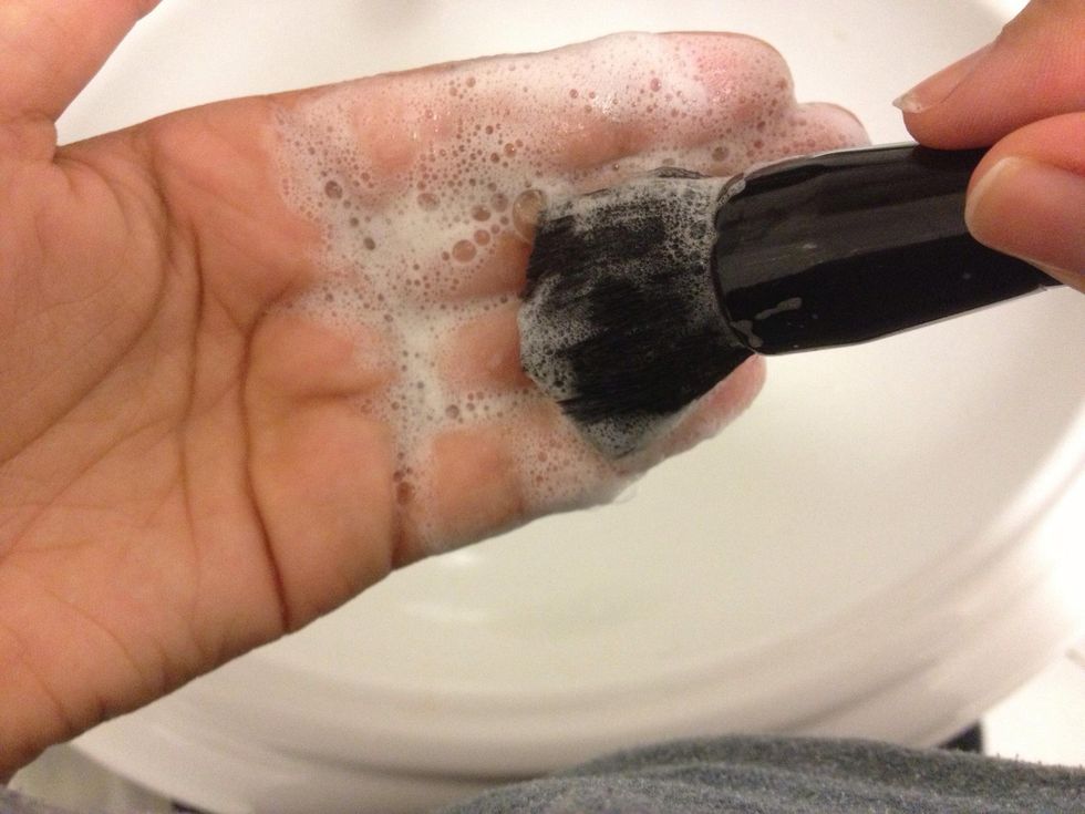 Swirl it around you hand to get it nice and foamy. This step pulls out all the makeup that is caked in, as well as disinfects.