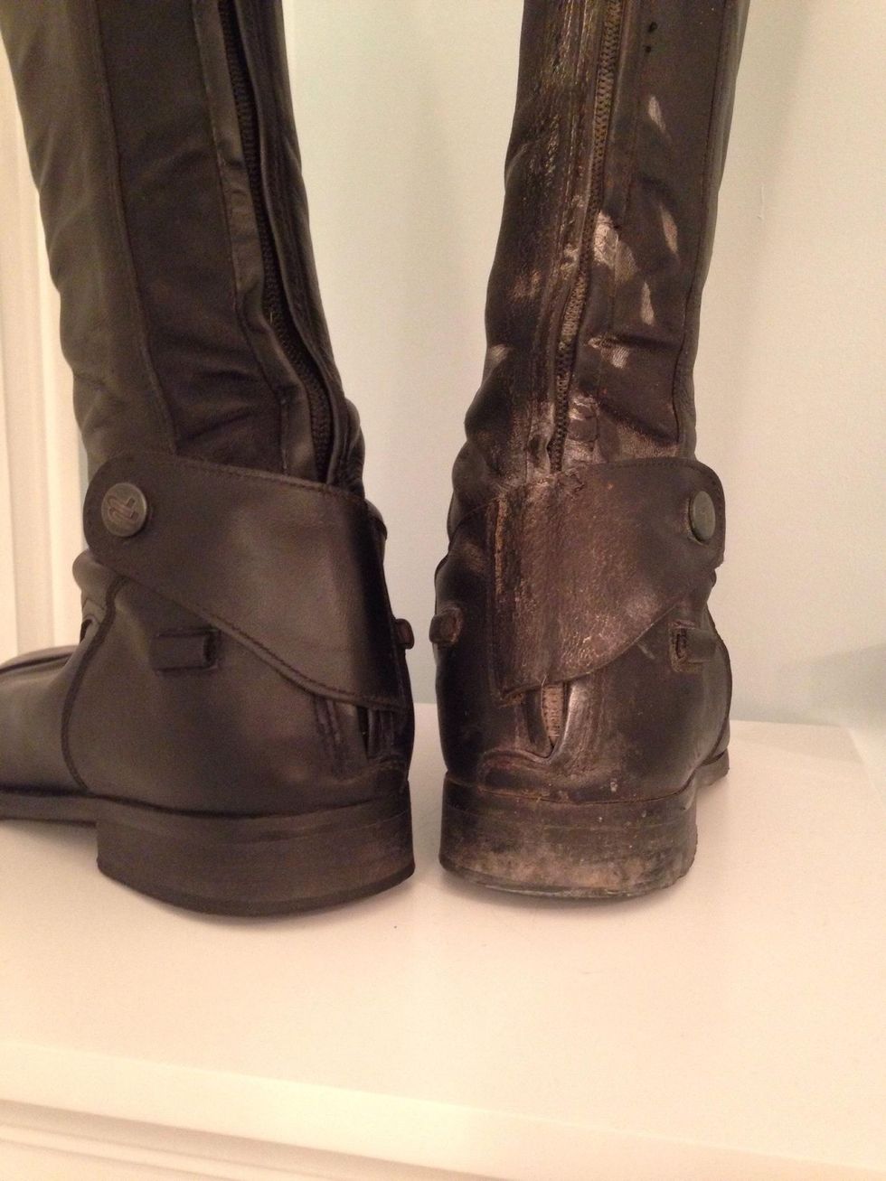 Once the Lexol dries, get some of the Meltonian on a brush or cloth and put a thin layer over the OUTSIDE of your boot (the side away from the horse). If it's on the inside, it will rub onto the horse