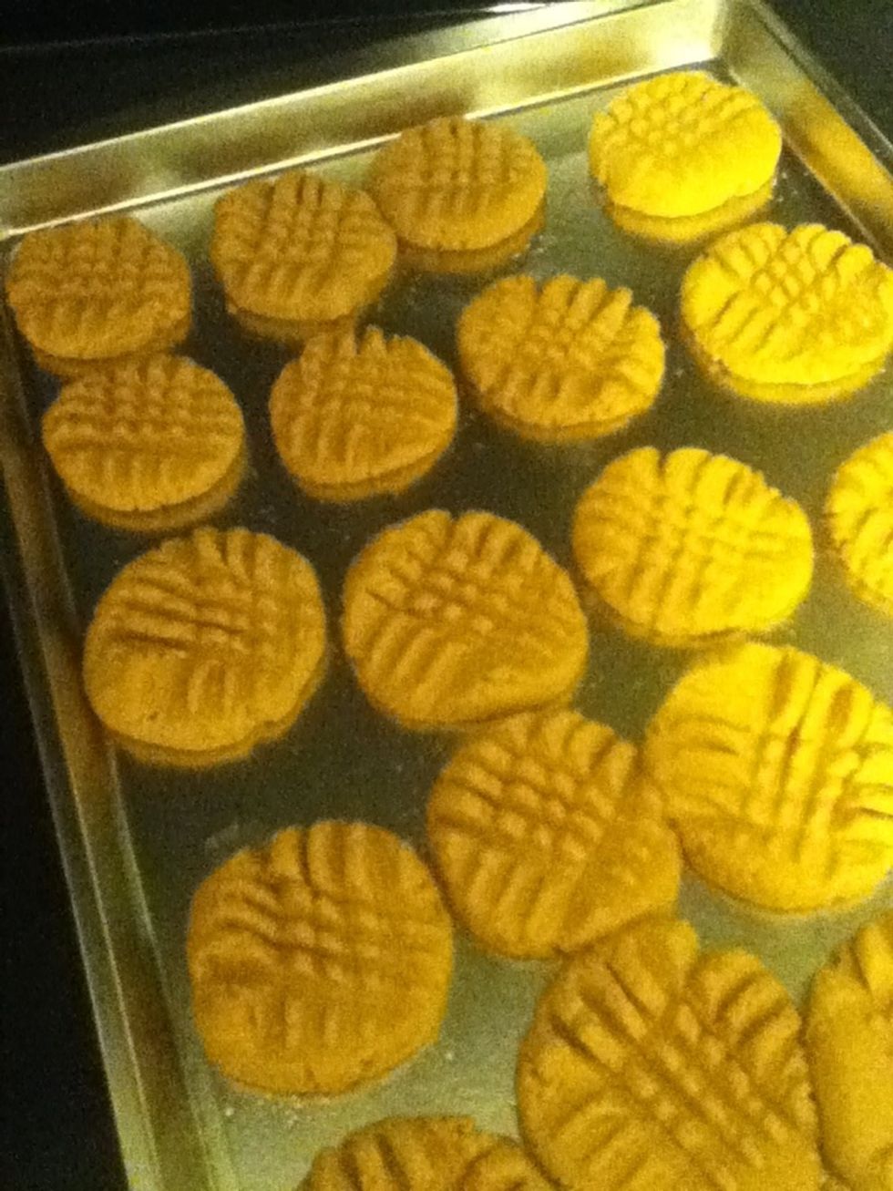 Put cookies onto a baking sheet (roughly 20 large cookies) and do the fork thing to flatten them a bit