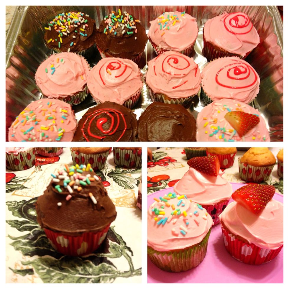 Ice the cupcakes with your favorite icing, we used strawberry and chocolate icing.