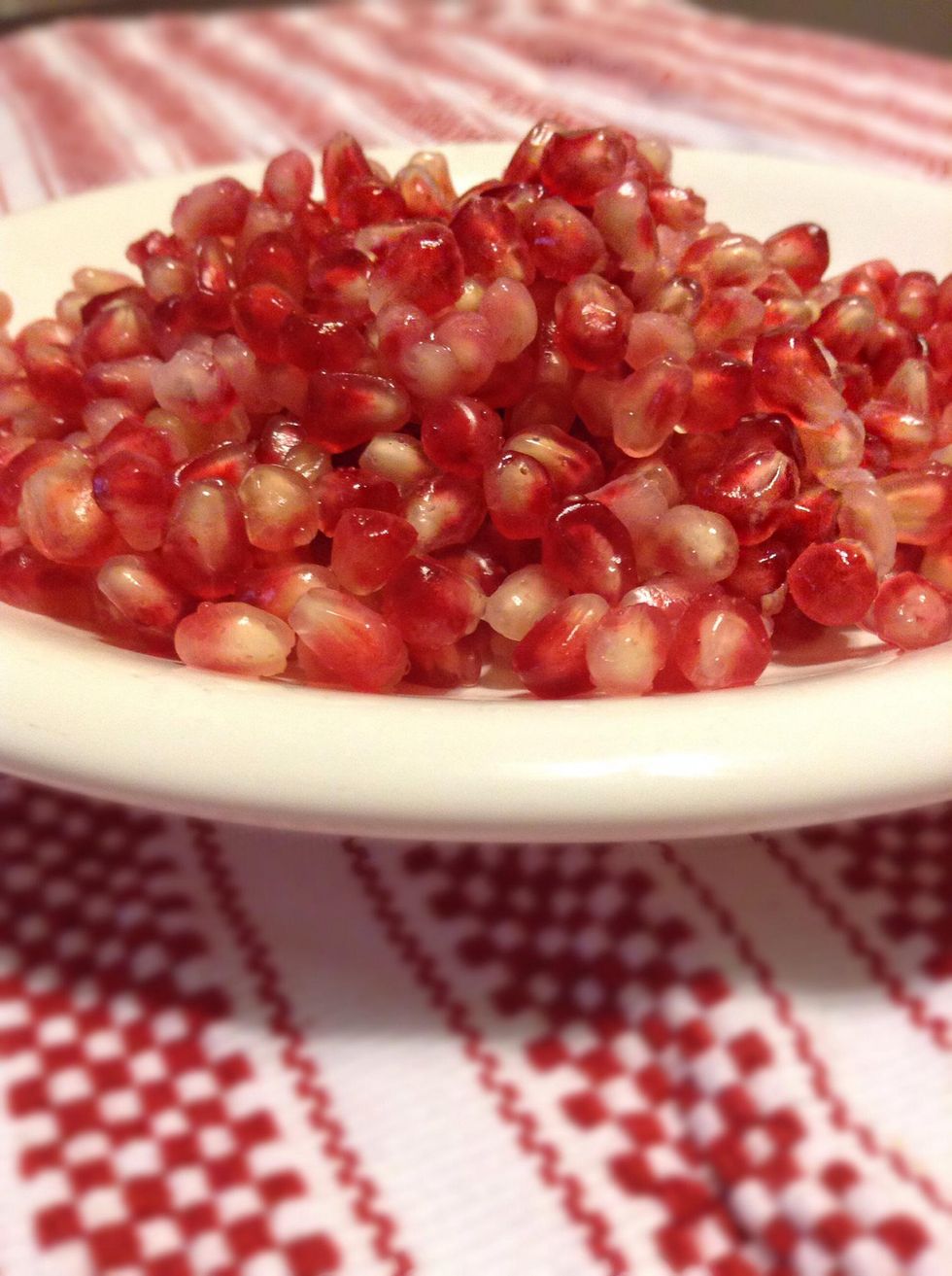 The jewel-bright seeds, or arils, of a pomegranate make a fabulous garnish for salads, desserts and many holiday dishes! This fruit also has MANY amazing health benefits!!! :)