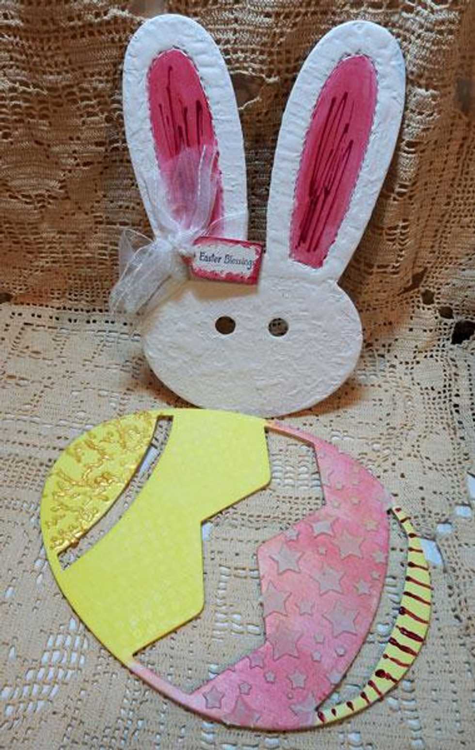 Using Mia Bella Sorbet, paint the bunny ears. Using a spackle knife, add Mud Texture Paste to the bunny. To create dimension in the ears, add streaks with Red Corvette Dimensional Crystal.